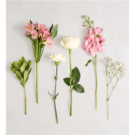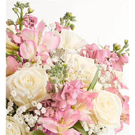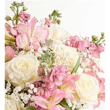 Our elegant bouquet in shades of blush pink and creamy white brings all the charm of a rustic country garden to the people you care about. Cascading blooms are hand-gathered with lush greenery and designed in a clear cylinder vase, creating a beautiful gift that delights with every detail. • All-around arrangement with white roses and carnations, pink Peruvian lilies (alstroemeria) and stock; accented with baby’s breath and assorted greenery • Extra large arrangement measures approximately 16""H x 14""W • Large arrangement measures approximately 15""H x 13""W • Medium arrangement measures approximately 13""H x 12""W • Small arrangement measures approximately 12""H x 11""W • Artistically designed a clear glass cylinder vase; large vase measures 6""H; medium/small vase measures 5""H • Our florists hand-design each arrangement, so colors and varieties may vary due to local availability • To ensure lasting beauty, lilies arrive in bud form, ready to bloom in a few days"